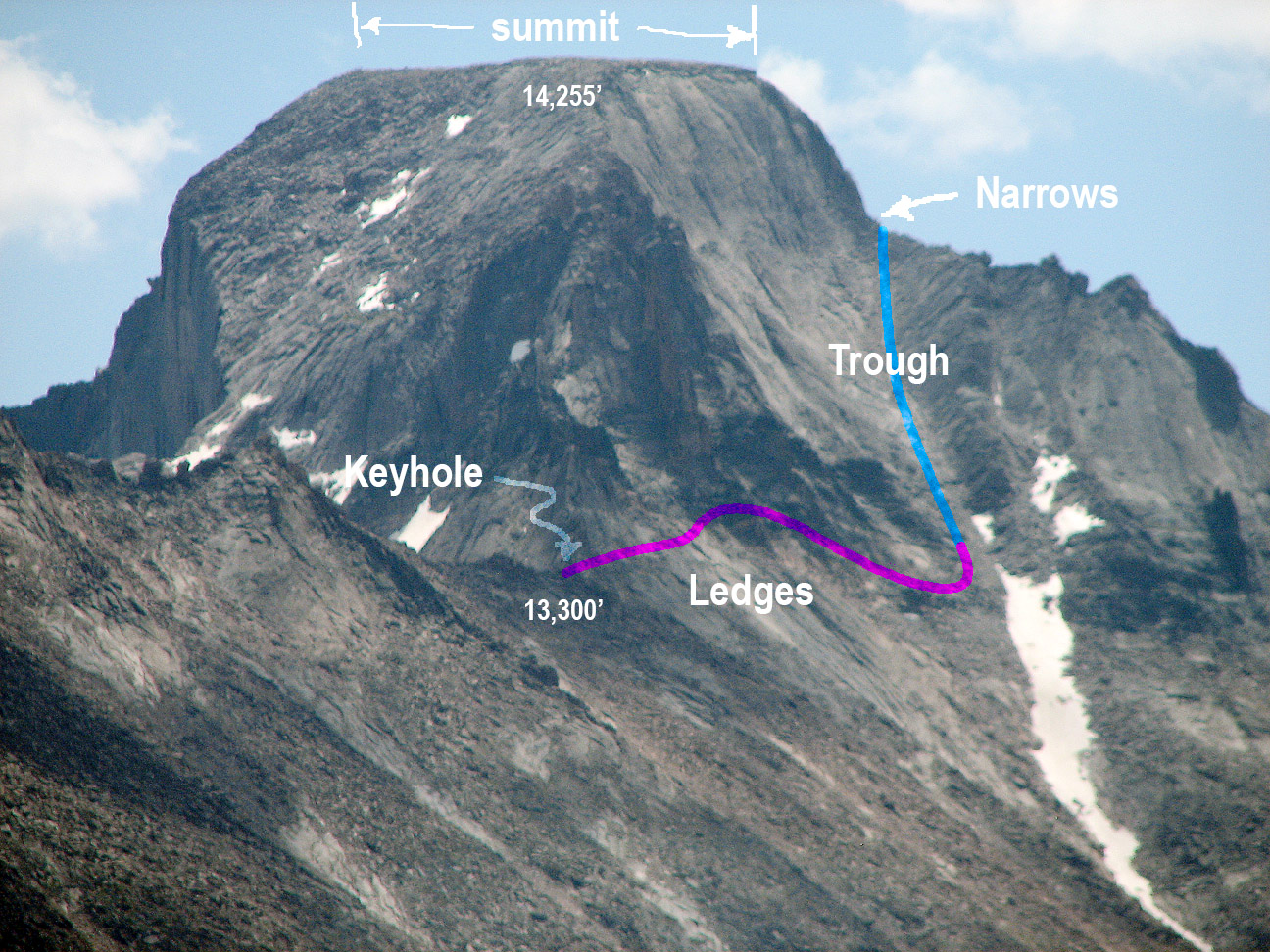 The highest point is a rock on the eastern side of the east half, marking an elevation of 14,255 feet.