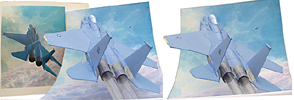 This uses the cross-eyed viewing method. Another view of the model with a reproduction of the originl painting on the left.